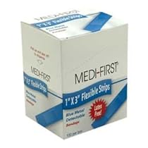 Blue bandages with foil insert for visibility if lost during food processing. Contains a foil to trigger metal detectors. Superior adhesive for a bandage that stays on. Lightweight flexible fabric bandage. Latex free. 100 per dispenser box. 1 inch by 3 inch flexible strips.- Contains a foil to trigger metal detectors
